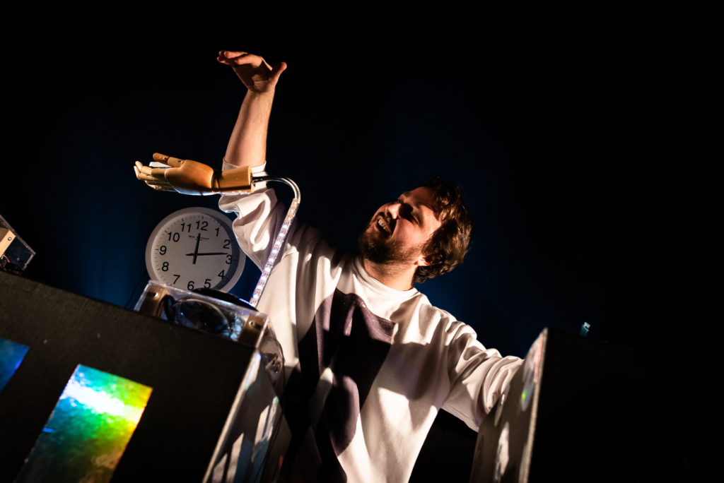 J’ai un nouvel objet là, qui arrive, c’est de loin ma plus grosse création. Ça a été une grosse galère, c’est hyper dur à expliquer. En gros, c’est une boîte, avec plein de boutons et des fidget spinners, tu vois ce truc des années 2010, qui me permettent de contrôler de la reverb quand je mets des coups dessus. J’ai des boutons nucléaires et des clés dessus, un peu comme des clés pour démarrer des voitures. Il faut que je fasse des doubles des clés d’ailleurs, parce que si je perds la seule que j’ai. La clé me permet de d’activer un bouton et de démarrer mon live, l’audio et l’ordinateur. Parce que si je ne l’ai plus, je ne peux plus jouer !